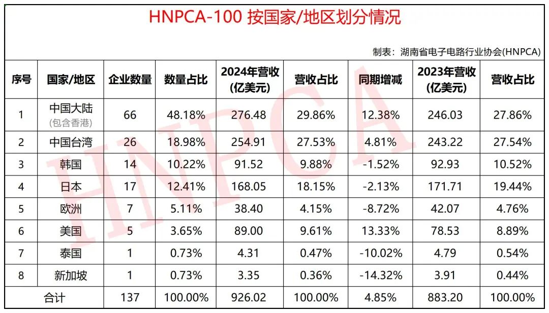 據(jù)統(tǒng)計,2024年全球共有137家PCB制造商的年營收超過1億美元,總營收達926.02億美元,較2023年的883.2億美元增長4.85%。此外,部分企業(yè)業(yè)務涵蓋多個領域,報告中所列為其PCB業(yè)務的營收(部分公司未進行詳細拆分,2024年營收說明一欄中注明了2024年營收一列的業(yè)務范圍),更具準確性和參考價值。